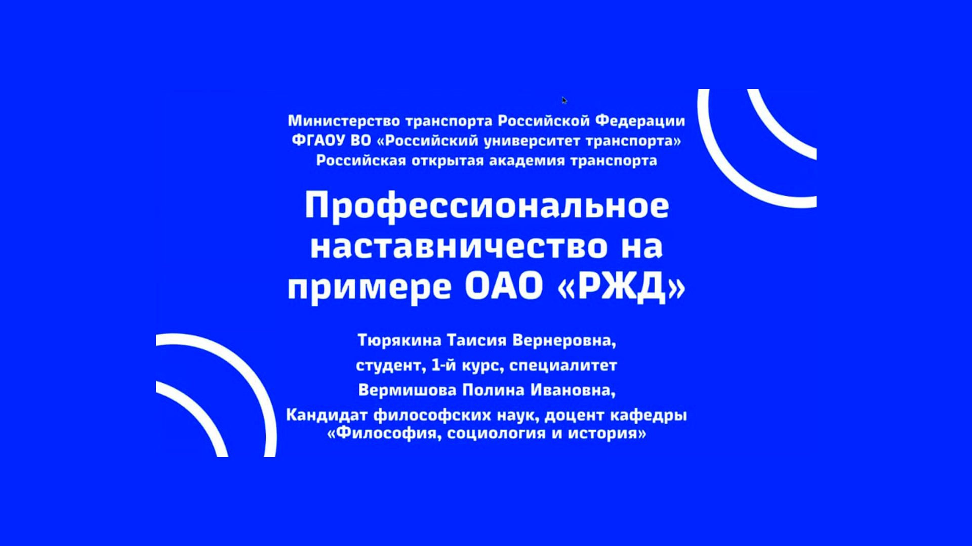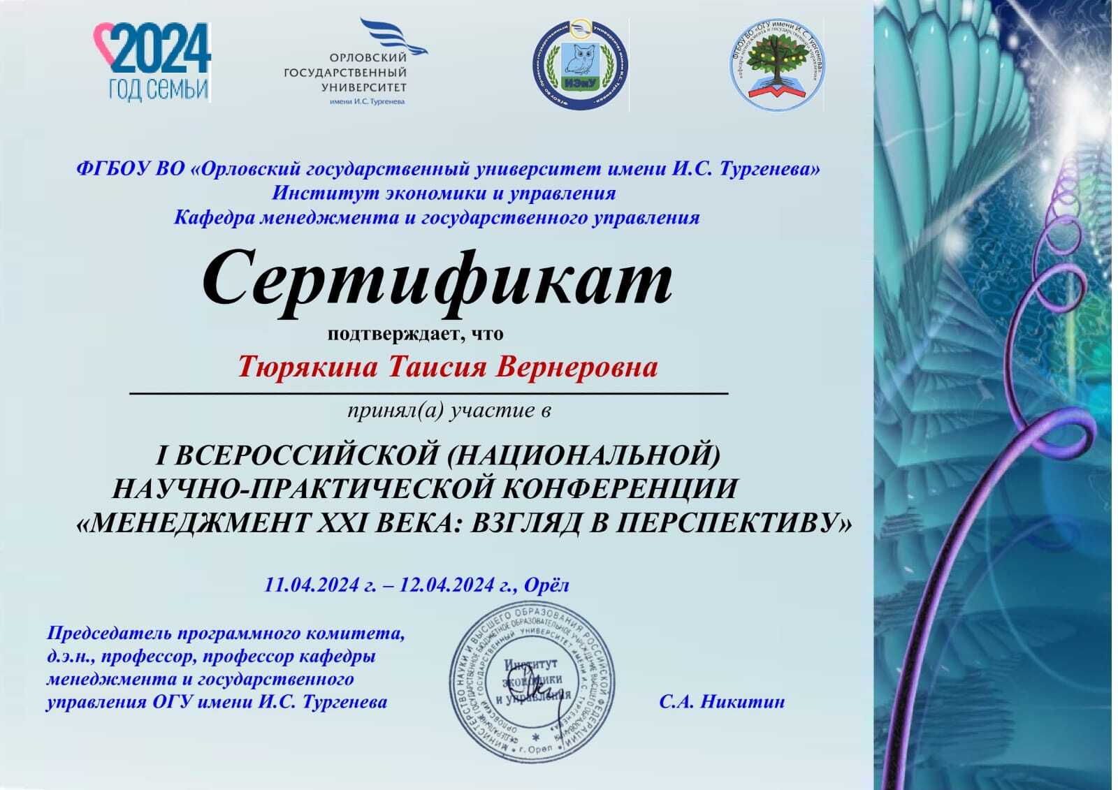 Студентка группы ЗДМ-163 Таисия Тюрякина успешно выступила с докладом «Профессиональное наставничество на примере ОАО «РЖД» на I Всероссийской (национальной) научно-практической конференции «Менеджмент XXI века: взгляд в перспективу», проведенной 11.04.2024 — 12.04.2024 в Орловском государственном университете им. И. С. Тургенева. Научный руководитель — доцент кафедры «Философия, социологи и история», к.ф.н. Вермишова П.И.